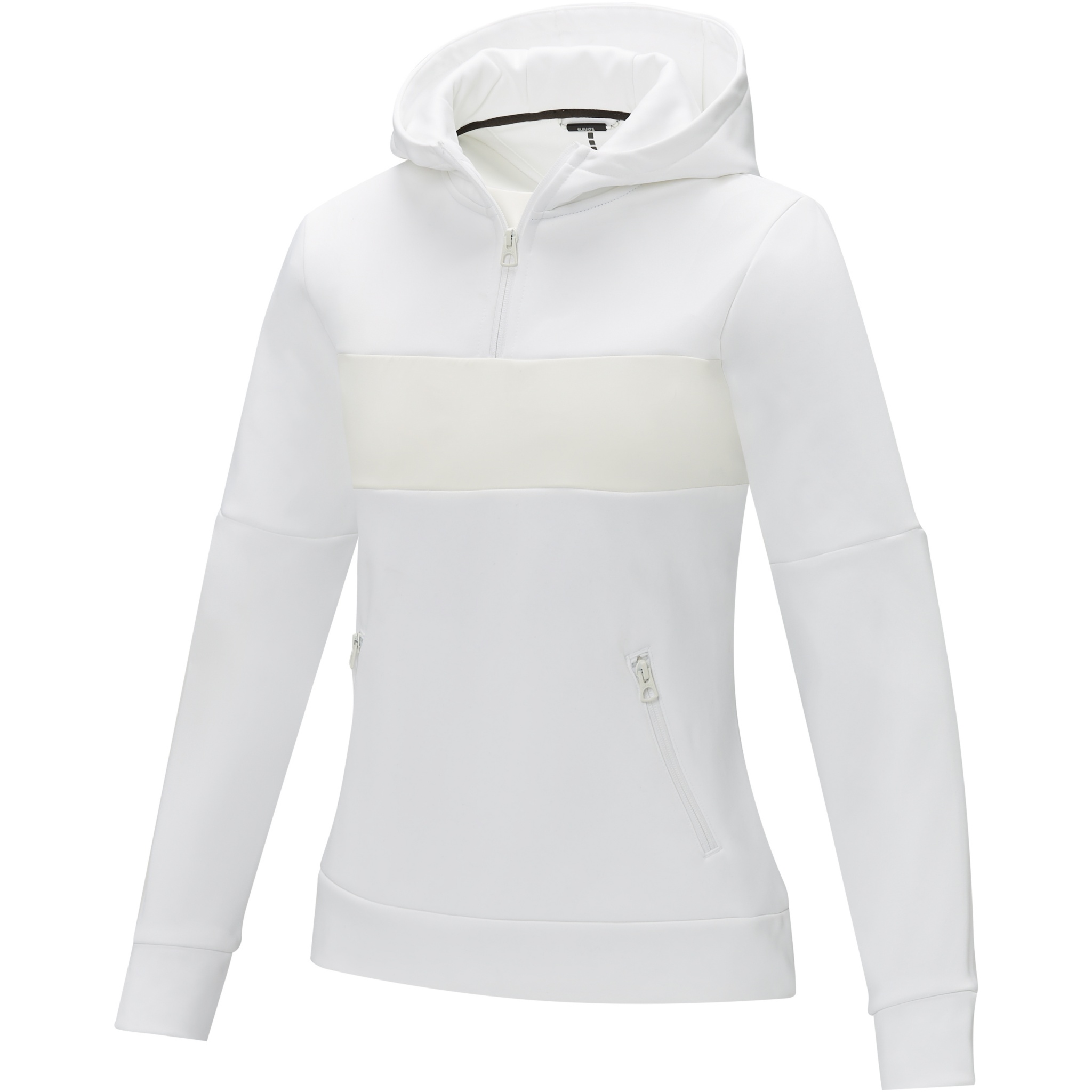 Sayan damtröja med halv dragkedja och huva i anorakmodell - en unik kombination av prestanda och stil. Anorakdesignen kombinerar mode och funktion på ett smidigt sätt och har en kvarts dragkedja för mångsidiga lager på lager. Tillverkad av en 350 g/m²-blandning av polyester och Sorona®-stickning. Sorona®-fibern förbättrar jackans miljövänlighet genom att integrera ett hållbart element utan att kompromissa med prestandan. Kontrasttyget på frontpanelen, tillverkat av 280T ripstop nylon, bidrar till designen med sin hållbarhet och struktur och är den perfekta platsen för att visa upp ditt varumärke. Oavsett om du ger dig ut på ett utomhusäventyr eller bara tar dig igenom vardagen kombinerar Sayan huvtröja mode med funktion på ett enkelt sätt. Tröjan är designad med en figurnära passform för en feminin look.