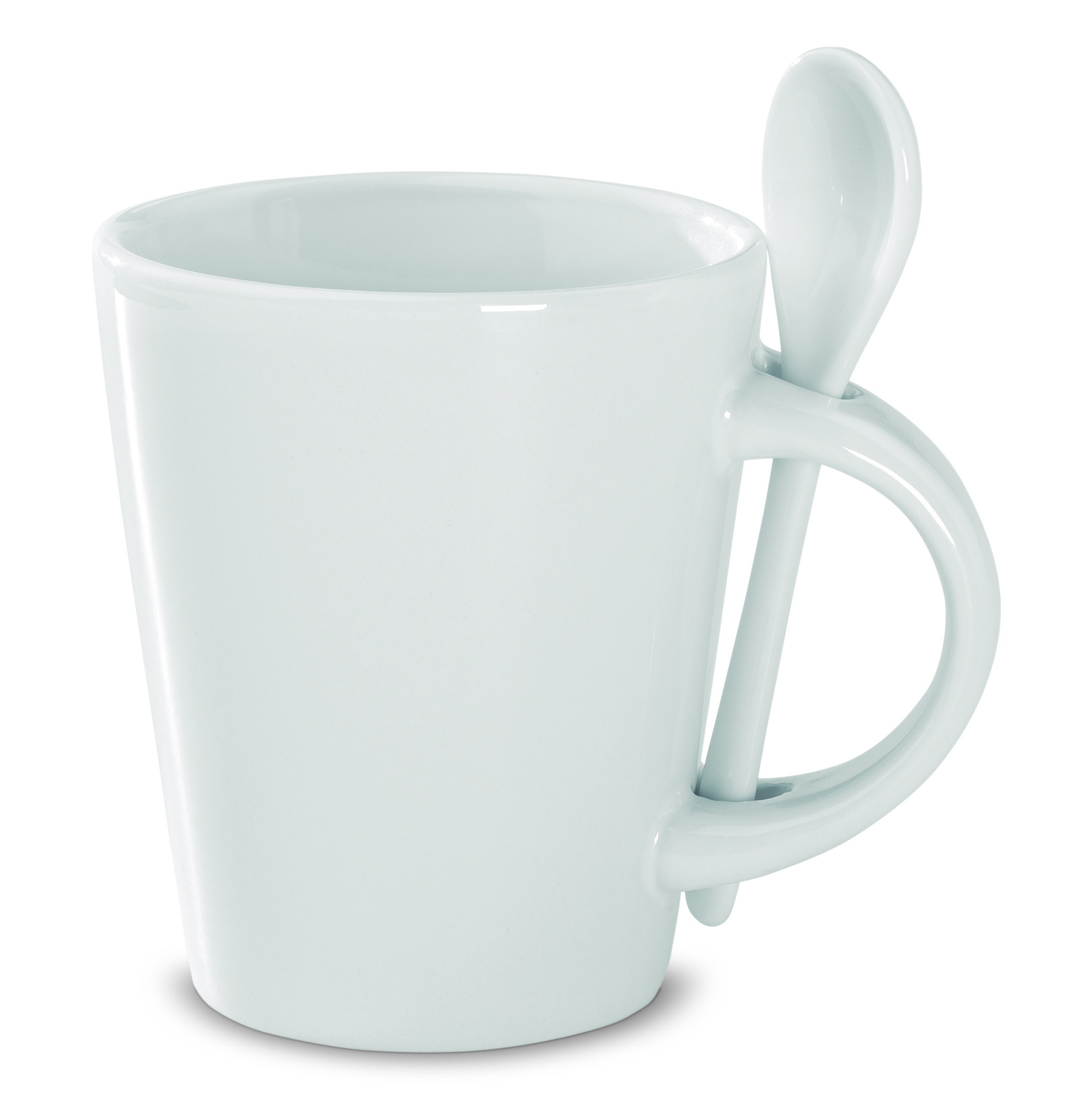 Mugg i stengods med sked. Koppen rymmer 300 ml och har en särskild beläggning för sublimeringstryck. Med sublimeringstryck kan du trycka bildmotiv som tål maskindisk runt hela muggen. Levereras i vit presentkartong.