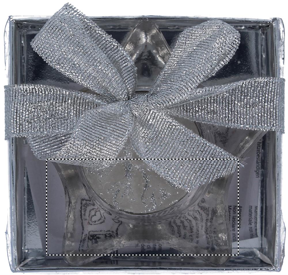 Stjärnformad värmeljusstake . Presenterad i silverfärgad presentask med transparent lock och dekorband. Glitterdekorerat värmeljus ingår.